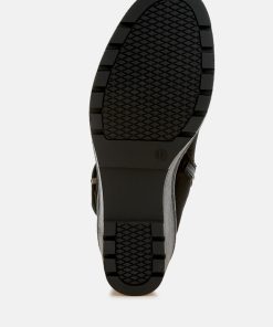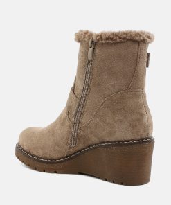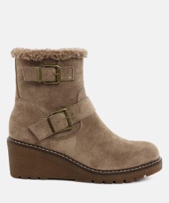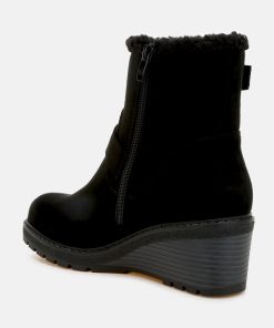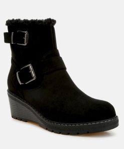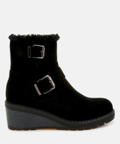 The high ankle boots are edgy and bold with the harness detail and faux fur collar! The cushioned insole and low wedge heels offer a comfortable and relaxed fit. Pair these with London Rag clothing for the best ensembles!