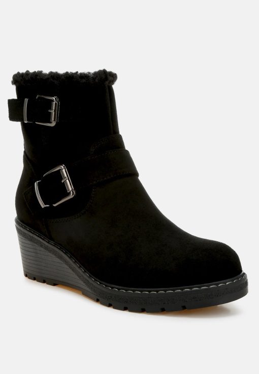 The high ankle boots are edgy and bold with the harness detail and faux fur collar! The cushioned insole and low wedge heels offer a comfortable and relaxed fit. Pair these with London Rag clothing for the best ensembles!