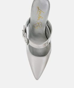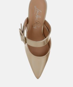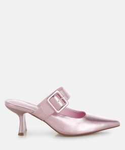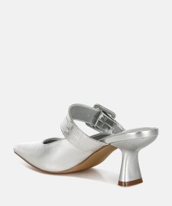Make every step a sun-kissed one with these gorgeous faux leather mule heels. The super chic kitten heel with a large pin buckle ankle strap detail is everything you need for your next party or a special dinner night. Pair these kitten heel mules featuring plush cushion insoles with denim, evening gowns, and more!
