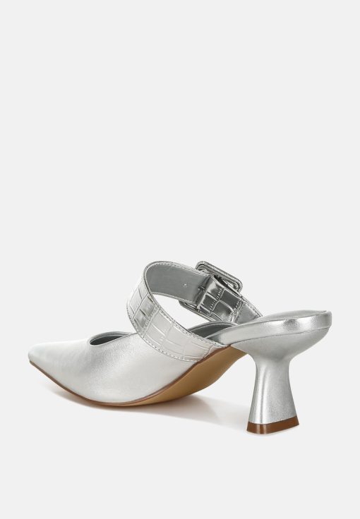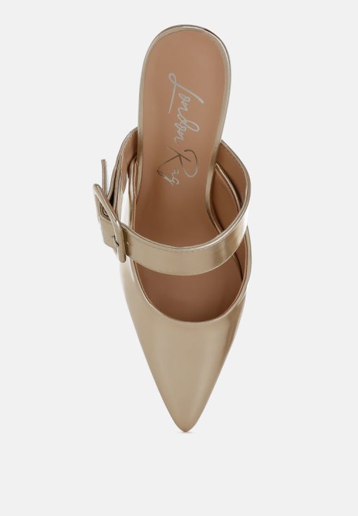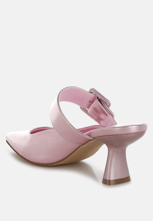 Make every step a sun-kissed one with these gorgeous faux leather mule heels. The super chic kitten heel with a large pin buckle ankle strap detail is everything you need for your next party or a special dinner night. Pair these kitten heel mules featuring plush cushion insoles with denim, evening gowns, and more!
