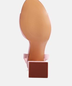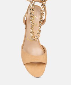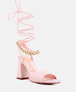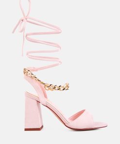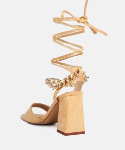 The triangular block heel sandals have a tie-up detail that makes them sexy and sleek, while the metal chain detail adds a fun aesthetic element to the strap. The thick block heels and cushion padded insole make the sandals comfortable to wear. These are perfect as party shoes, wedding guest shoes, bridal shoes, and much more.