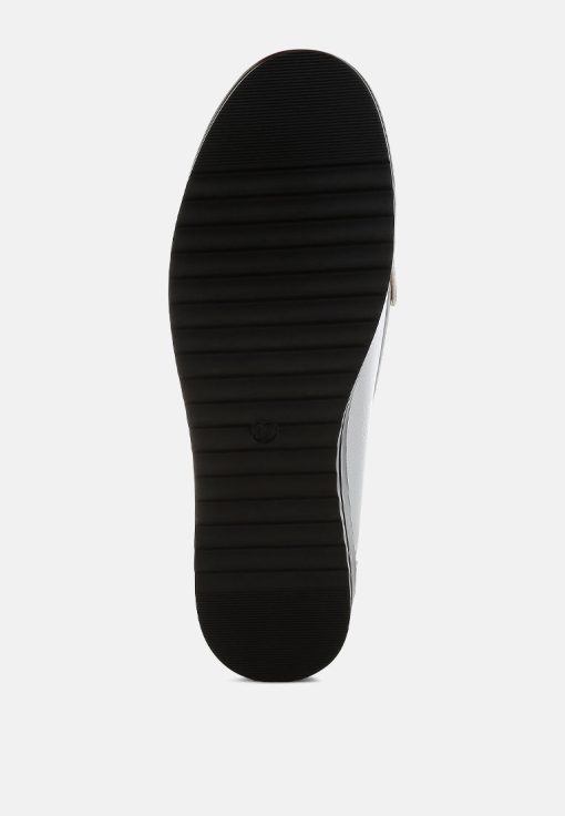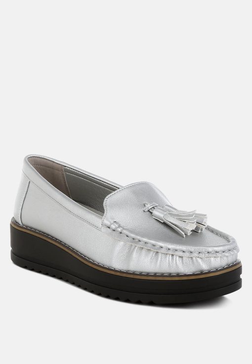 Experience our refined faux leather loafers with a chic tassel detail. These flatform faux leather loafers shine with a metallic finish and timeless mock stitch. Style these round-toe beauties with cigarette pants, chinos, or cozy loungewear for a look that’s sure to impress.