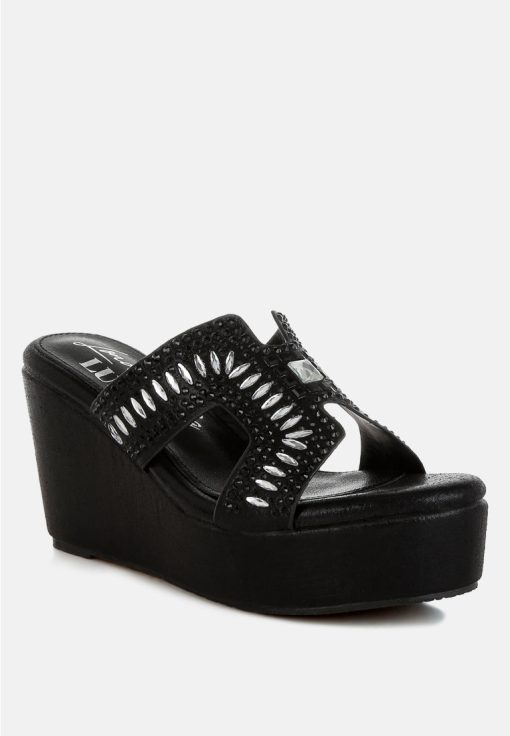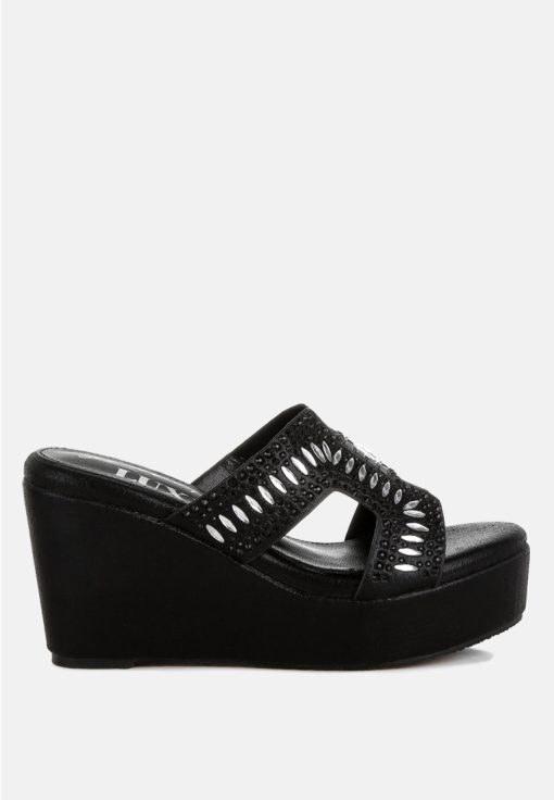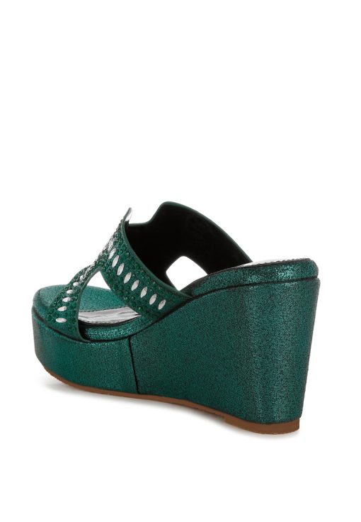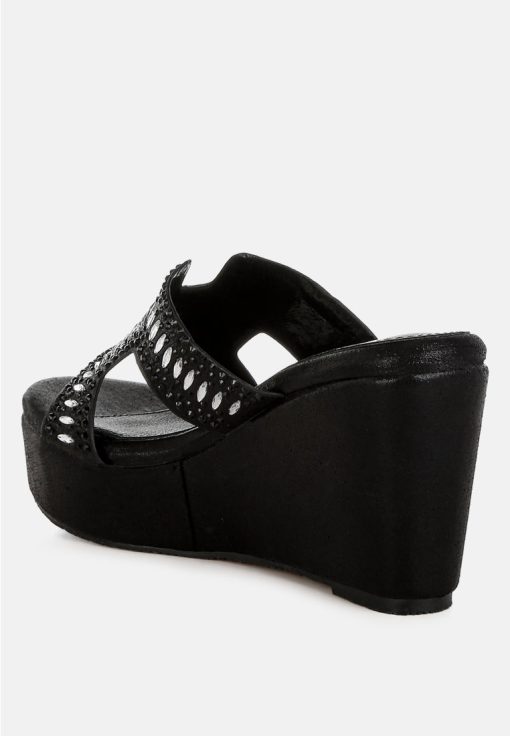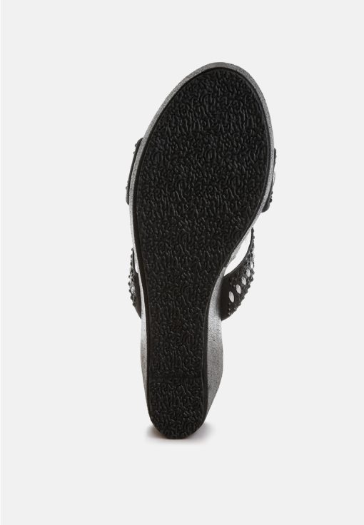The high wedge sandals, with a chic 3-inch heel height, are exclusively stunning. They feature diamante and rhinestone-embellished cut-out details that make them a must-buy this wedding season. The slip-on wedge sandals, with an edgy silhouette and plush cushion insoles, are everything you need to pair with an evening gown or date night thread.