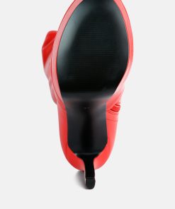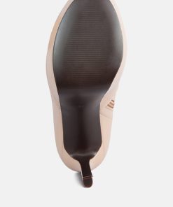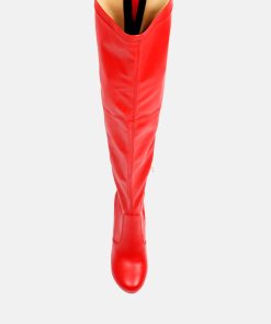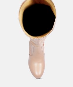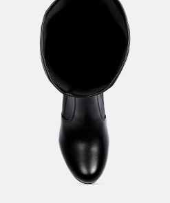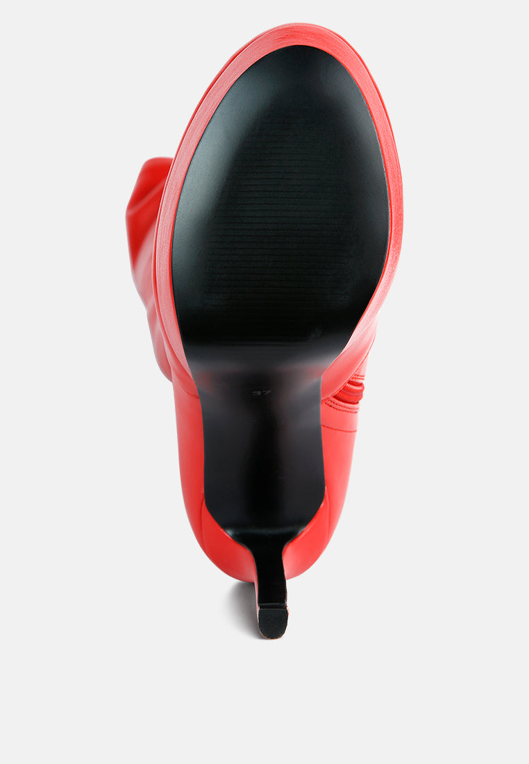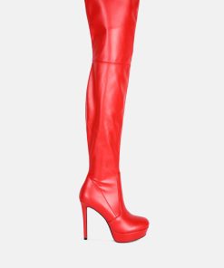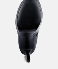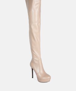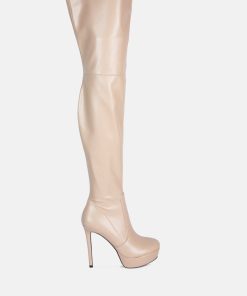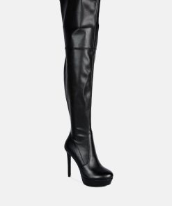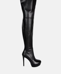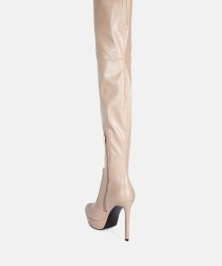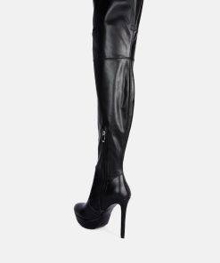 High Platform pointed toe stiletto booties come with multi-panel construction which offers flexibility and sets on the foot along the body curves very well. The long over-the-knee boots come with elastic gussets on top, at the back. It has a side zipper opening which facilitates wearing.