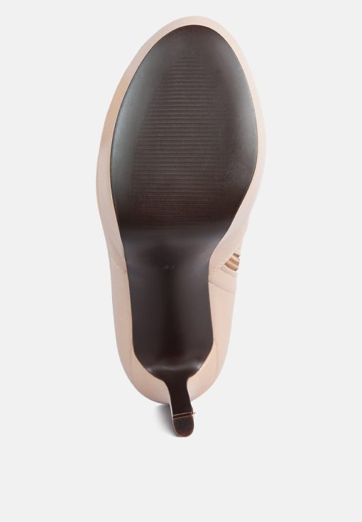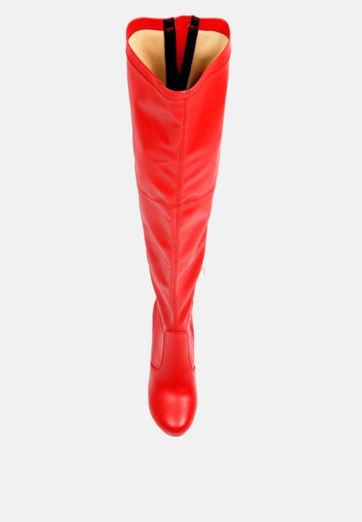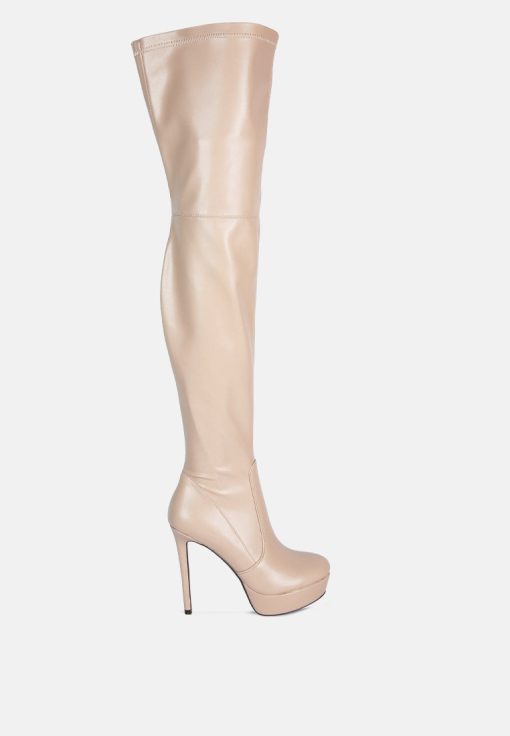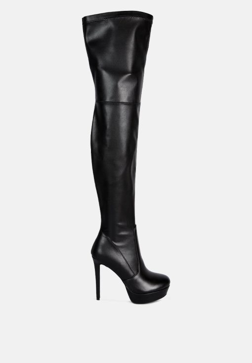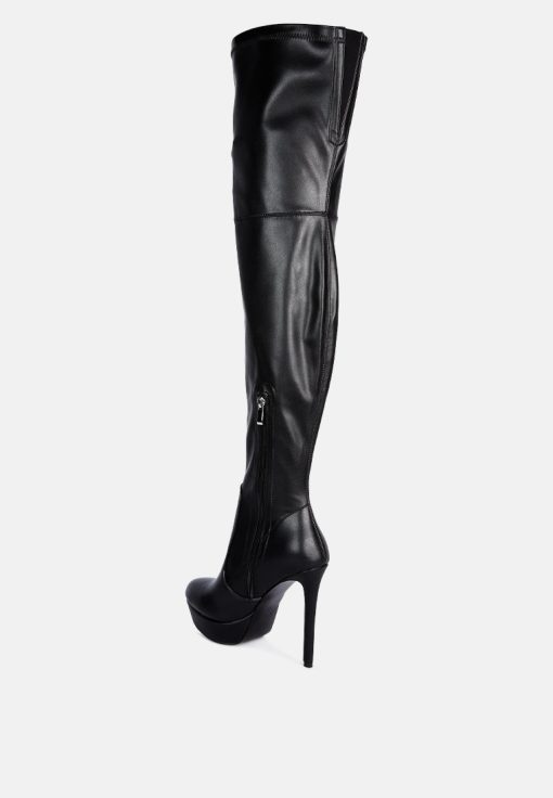 High Platform pointed toe stiletto booties come with multi-panel construction which offers flexibility and sets on the foot along the body curves very well. The long over-the-knee boots come with elastic gussets on top, at the back. It has a side zipper opening which facilitates wearing.