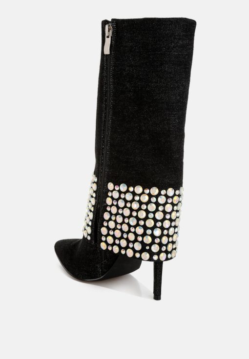 A pair of bling beauties, the foldover beauties exhibit an elegant and sophisticated demeanor with structured diamante and rhinestone embellishments. The boots are ravishing and would definitely turn some heads your way!
