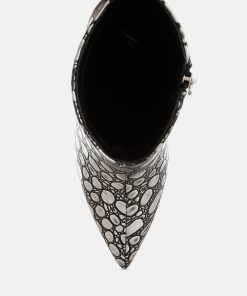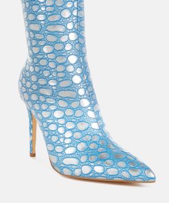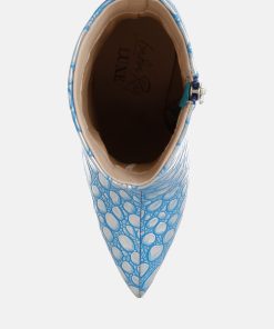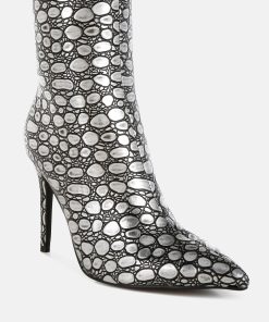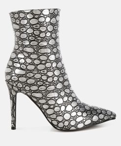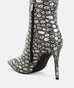 Crafted from premium faux leather, these ankle boots feature a pointed toe, slender stiletto heel, and side zip closure. Their 4-inch height and embossed detail make them a standout choice for pairing with a cocktail dress or trench coat for any event. A must-have addition to your shoe collection.
