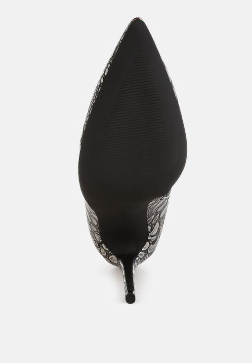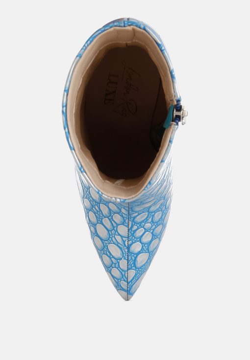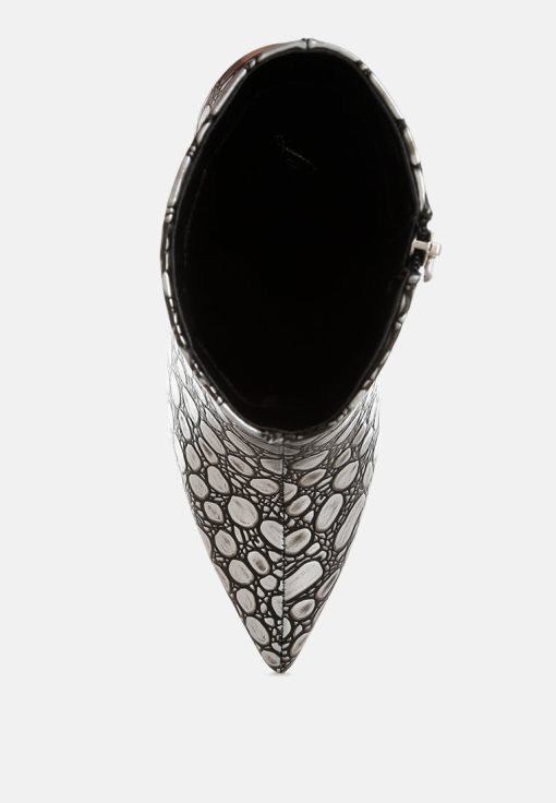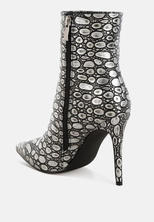 Crafted from premium faux leather, these ankle boots feature a pointed toe, slender stiletto heel, and side zip closure. Their 4-inch height and embossed detail make them a standout choice for pairing with a cocktail dress or trench coat for any event. A must-have addition to your shoe collection.