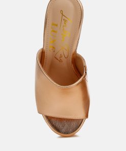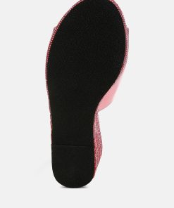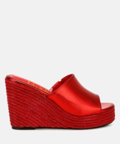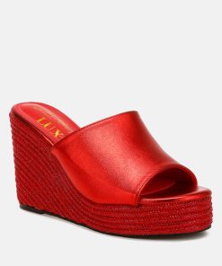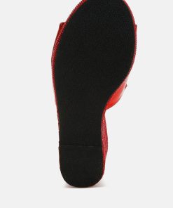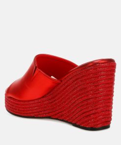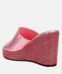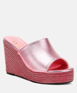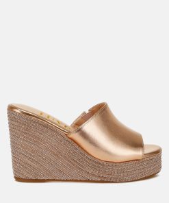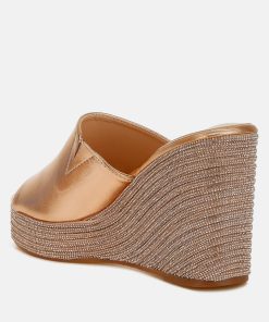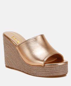 Where elegance meets comfort—a one-of-a-kind metallic faux leather slip-on sandals with comfortable cushion insoles. Perfect for wedding dresses and bridal showers, the high wedge heel sandals are also party and date-ready! With stunning rhinestone embellishments and a closed-round toe, these peep-toes are a must-buy!