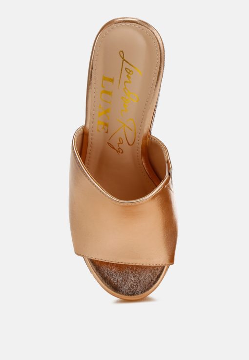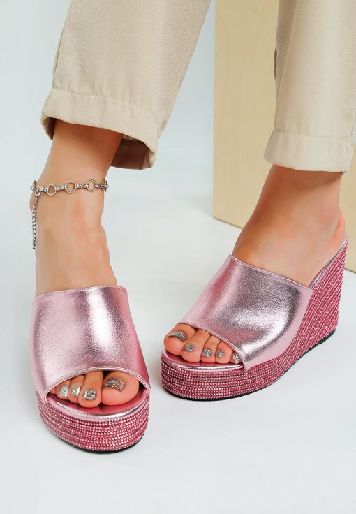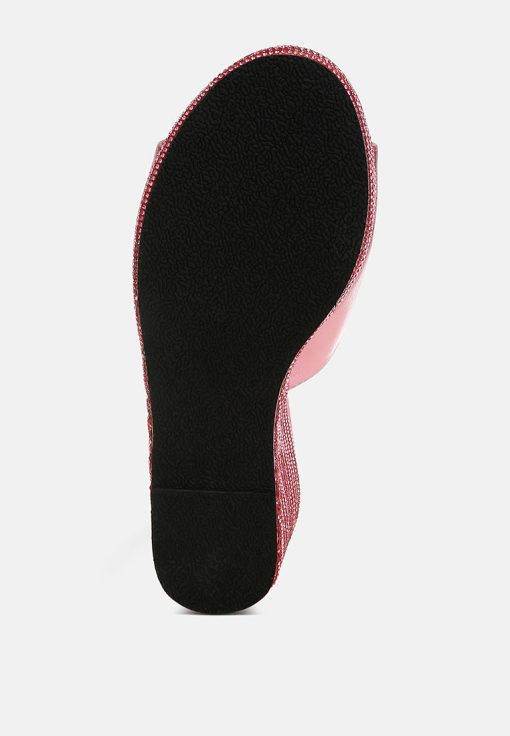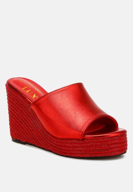 Where elegance meets comfort—a one-of-a-kind metallic faux leather slip-on sandals with comfortable cushion insoles. Perfect for wedding dresses and bridal showers, the high wedge heel sandals are also party and date-ready! With stunning rhinestone embellishments and a closed-round toe, these peep-toes are a must-buy!