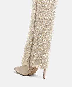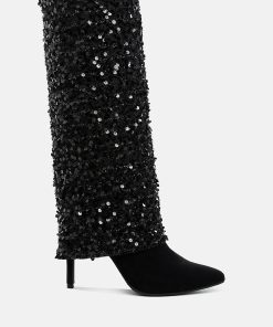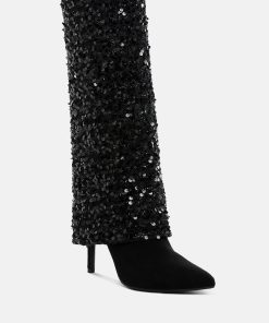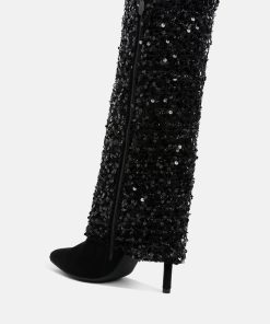 These exquisitely stunning boots are everything you need to turn heads and garner compliments. With a pointed toe, soft microfiber upper, and a dazzling sequin-covered fold-over design, they’re absolutely irresistible. Pair these gorgeous calf-high boots with a party dress or a chic mini-skirt for an unforgettable look.