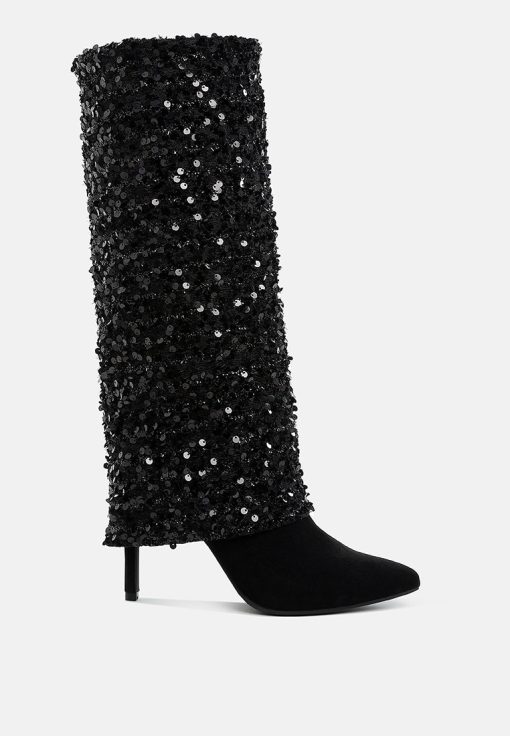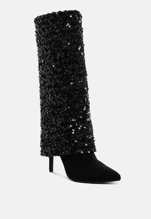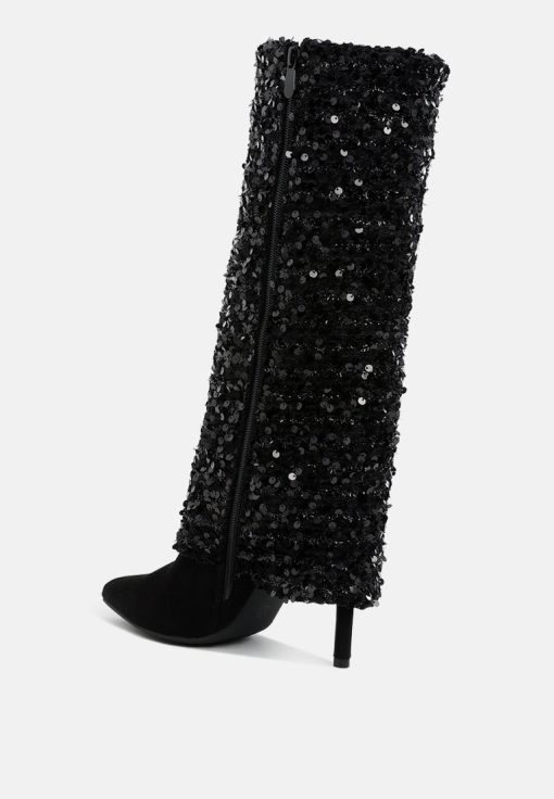 These exquisitely stunning boots are everything you need to turn heads and garner compliments. With a pointed toe, soft microfiber upper, and a dazzling sequin-covered fold-over design, they’re absolutely irresistible. Pair these gorgeous calf-high boots with a party dress or a chic mini-skirt for an unforgettable look.