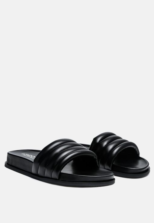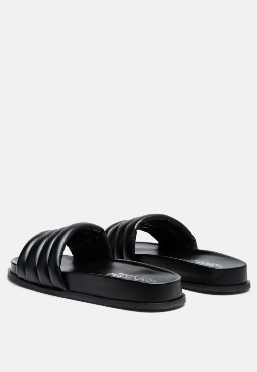 Quilted Strap Pool slides which offer great wear across surfaces, can be worn indoors and outdoors alike. The round-toe flats are all-day comfy pairs.