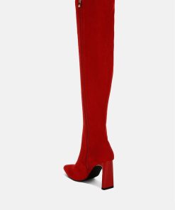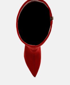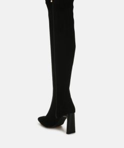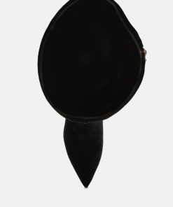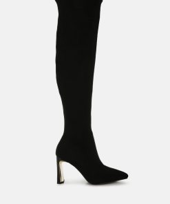 The long boots are stylish and sleek, and have a pop of glamour with the metallic accent flared slim block heels. The long boots have a minimalist aesthetic with a touch of bling and would pair beautifully with short skirts and faux leather shorts from London Rag.
