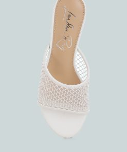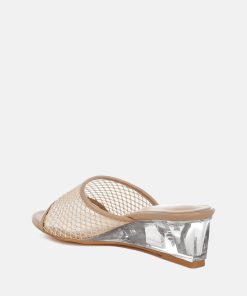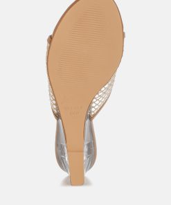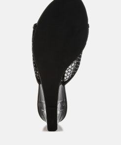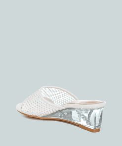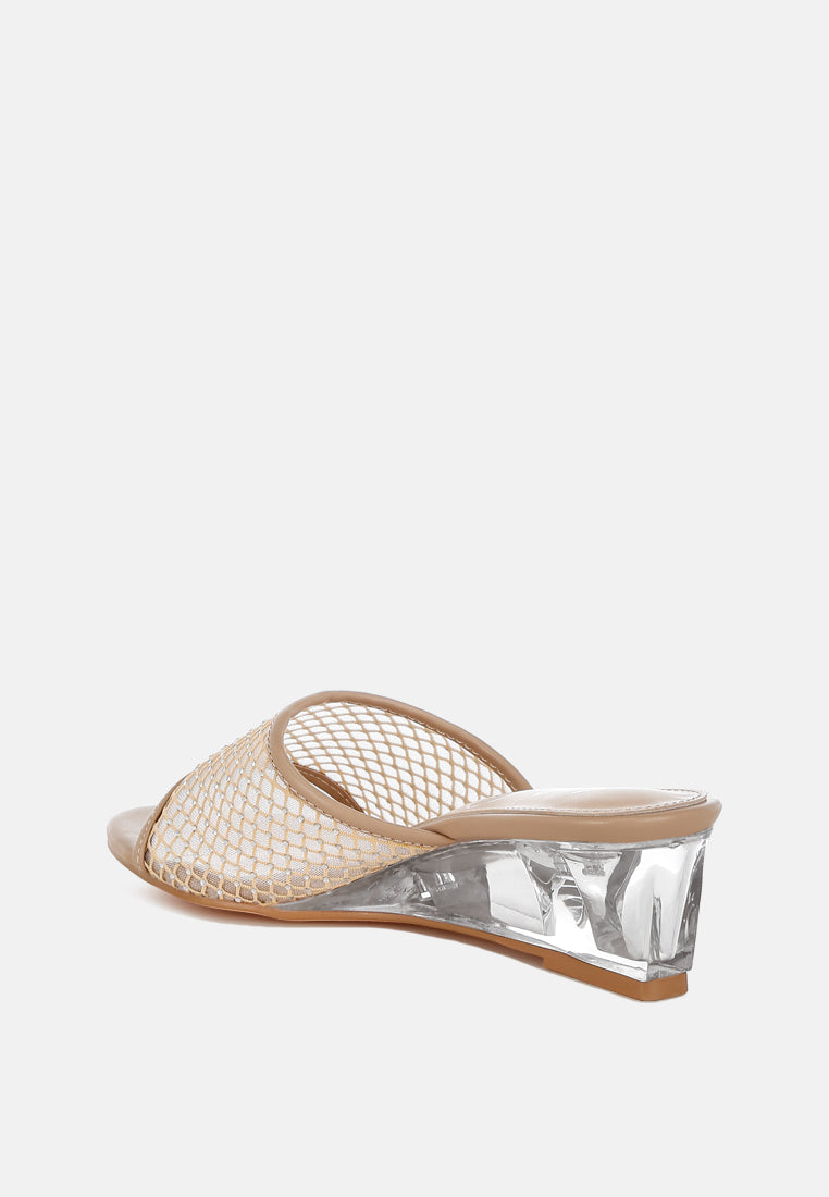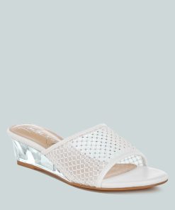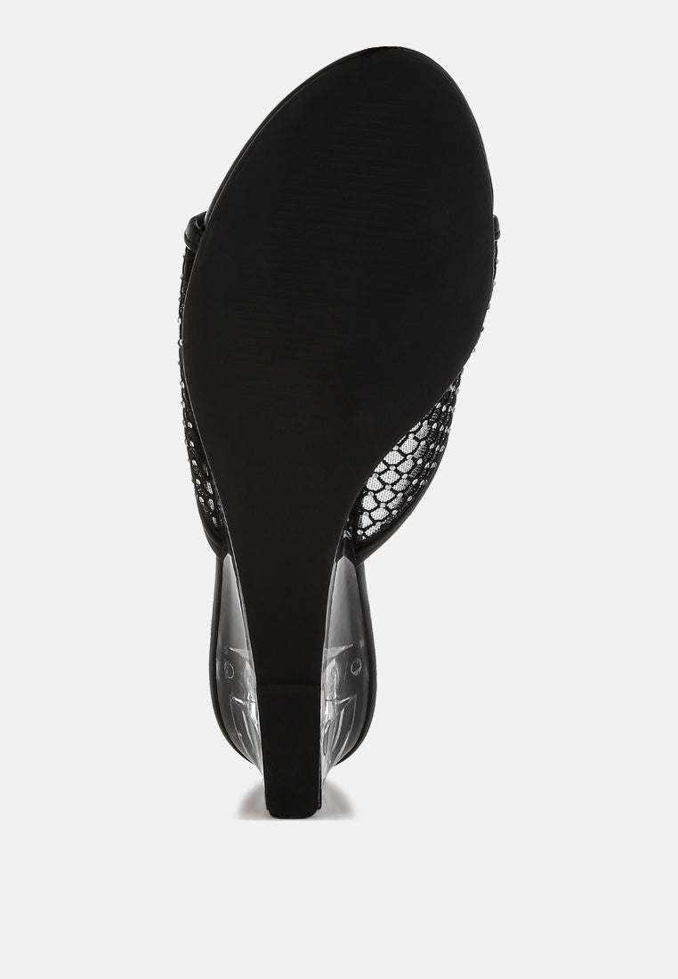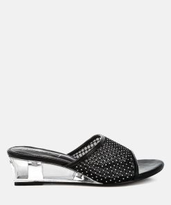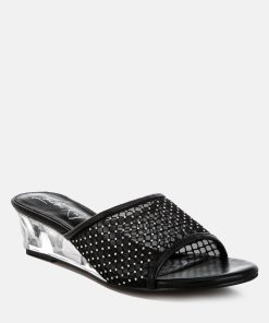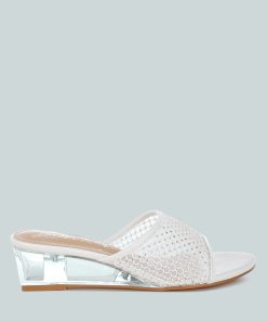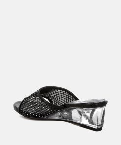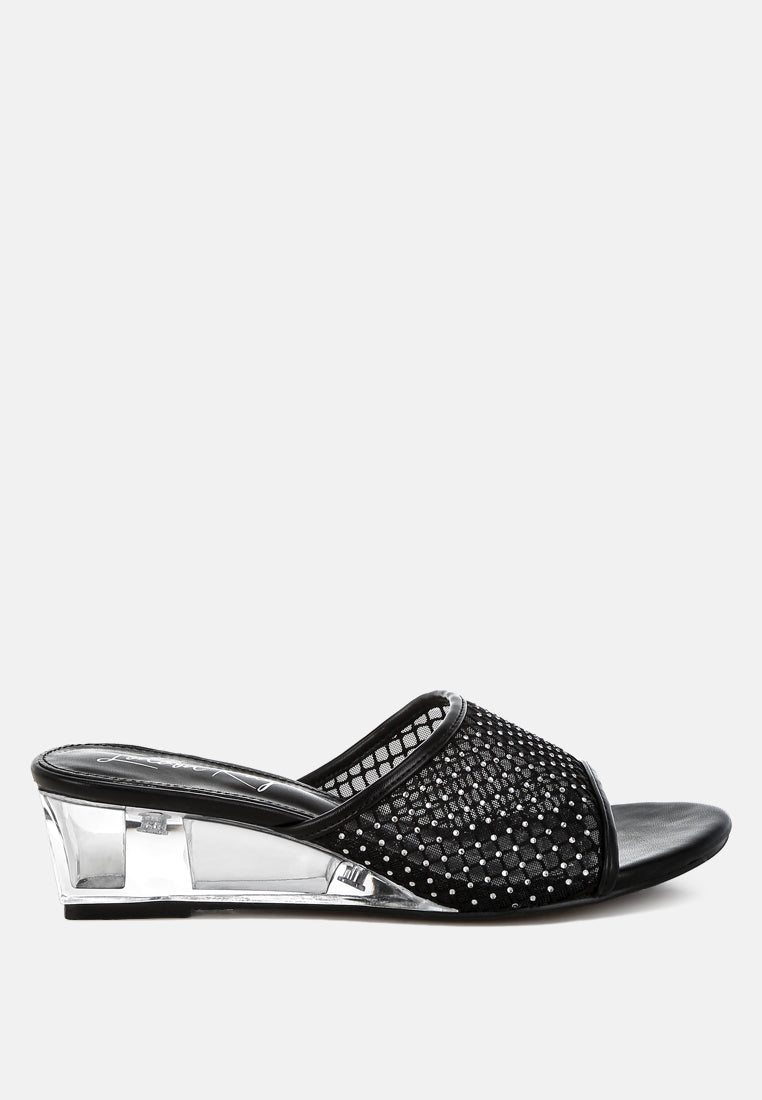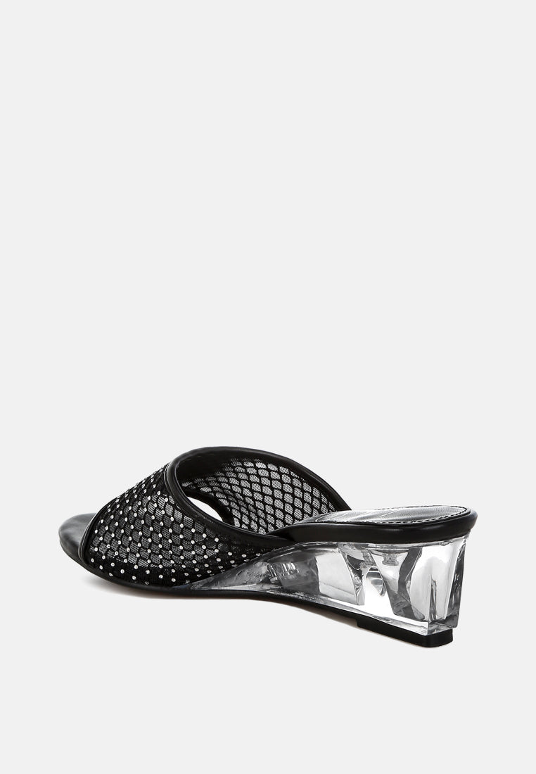 Give your footwear collection a stylish upgrade with these exquisite slip-on sandals. Designed with a rhinestone-studded mesh upper and clear wedge heels, they bring just the right amount of sparkle. Perfect for parties, weddings, or even pairing with your favorite casual looks.