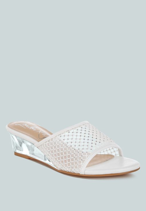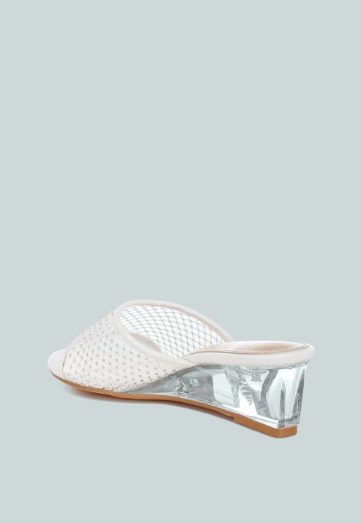 Give your footwear collection a stylish upgrade with these exquisite slip-on sandals. Designed with a rhinestone-studded mesh upper and clear wedge heels, they bring just the right amount of sparkle. Perfect for parties, weddings, or even pairing with your favorite casual looks.