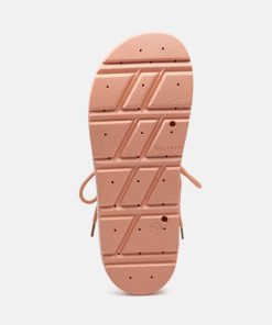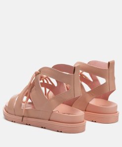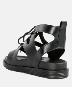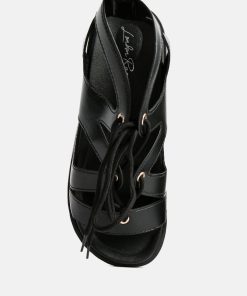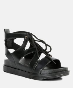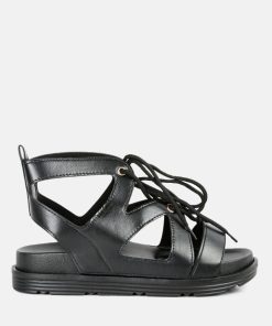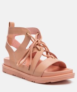Tie-up detail flat sandals with soft faux leather with tie-up detail which secures feet well. Has gripping outsole which gives grip across all surfaces.