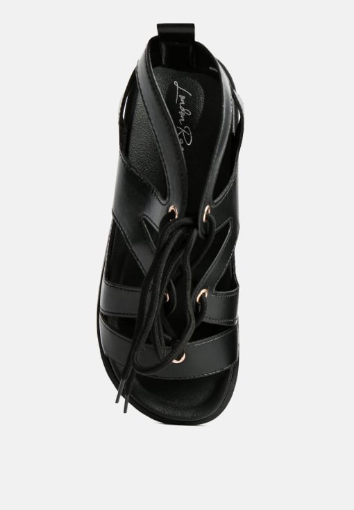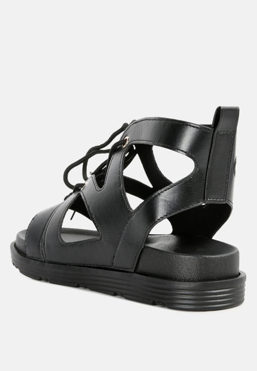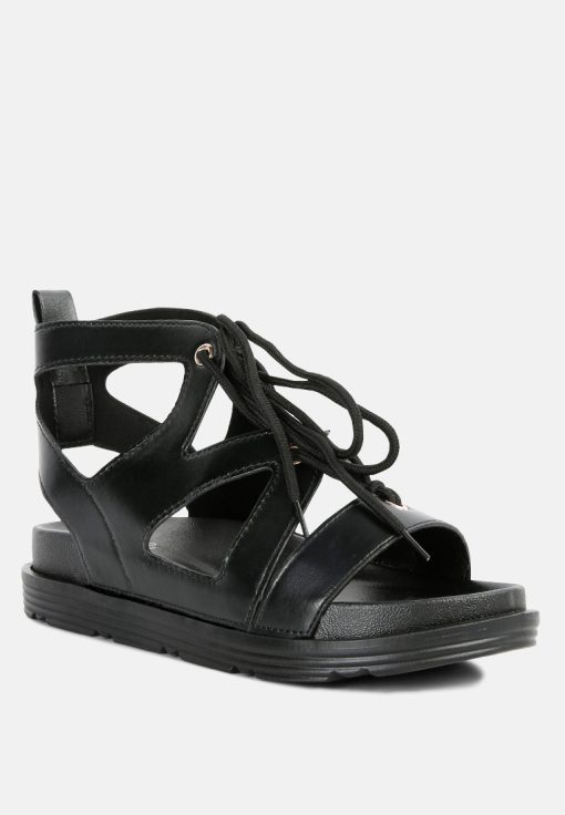 Tie-up detail flat sandals with soft faux leather with tie-up detail which secures feet well. Has gripping outsole which gives grip across all surfaces.